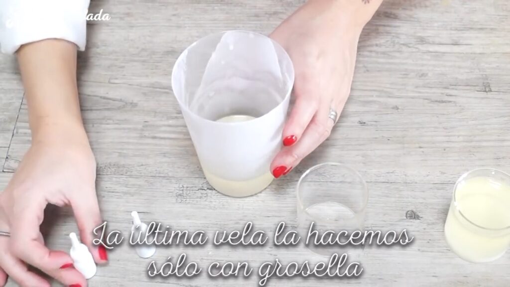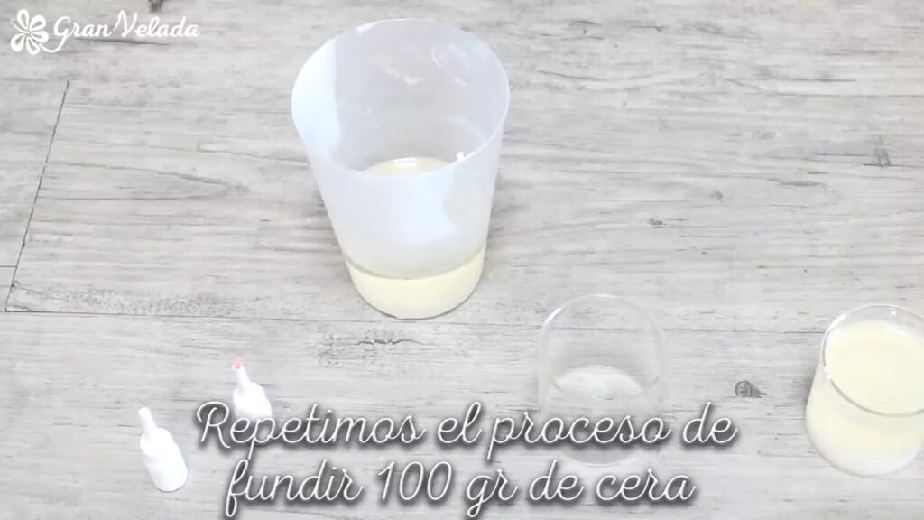 - Para la vela blanca, verter la cera en un vaso sin añadir colorante.